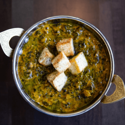 Paneer (homemade cheese) cooked with chopped spinach & freshly ground spices, garlic, ginger, onion, & tomatoes