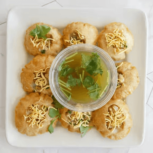 8 pieces. Crispy hollow puris filled with a mixture of spiced potatoes, onions, and flavored water