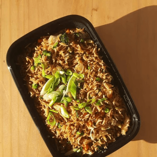 Stir-fried cooked rice with chicken, shrimp, egg, chicken sausage & veggies.