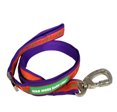 Our premium dog leashes add a playful element to your everyday walk! Featuring the "wag more, bark less" slogan, these 4' leashes come in three different colors: Orange/Blue/Red, Blue/Purple/Green, or Orange/Green/Purple. Contains webbing made from recycled plastic bottles, and comes with a premium locking carabiner closure. This leash is perfect for medium and large sized dogs.