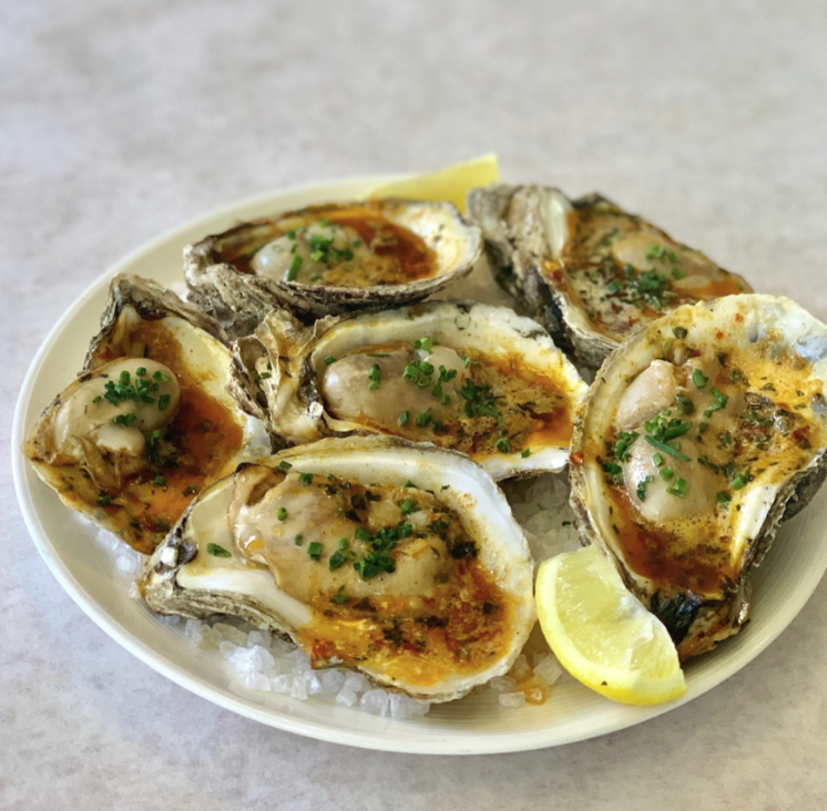 East: rockefeller oyster, chipotle bbq. West: uni butter oyster, nola butter