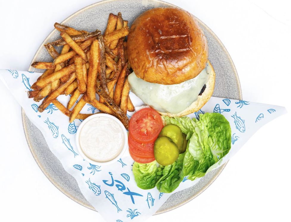 lettuce, tomato, pickles, jax mustard, french fries