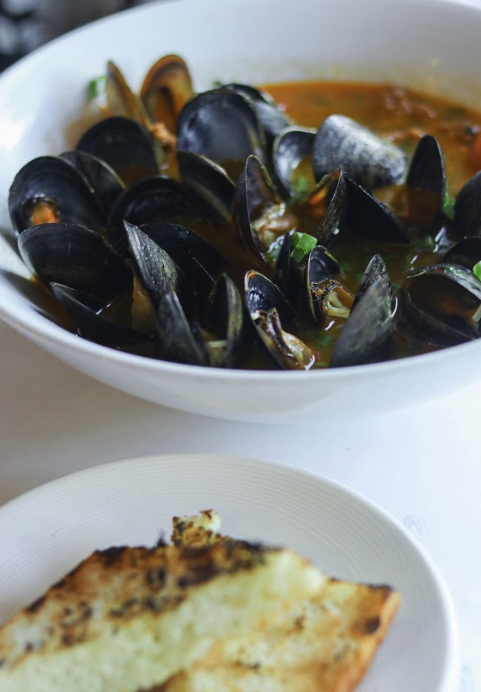 tomato chorizo: saffron tomato broth, polidori chorizo, ndjua whitebean puree, toast points. chardonnay: garlic, shallot, parsley, butter